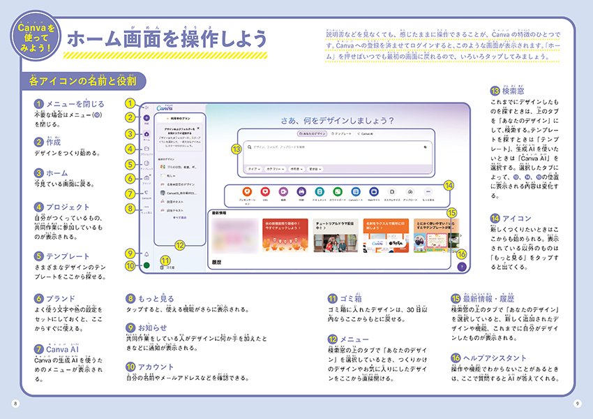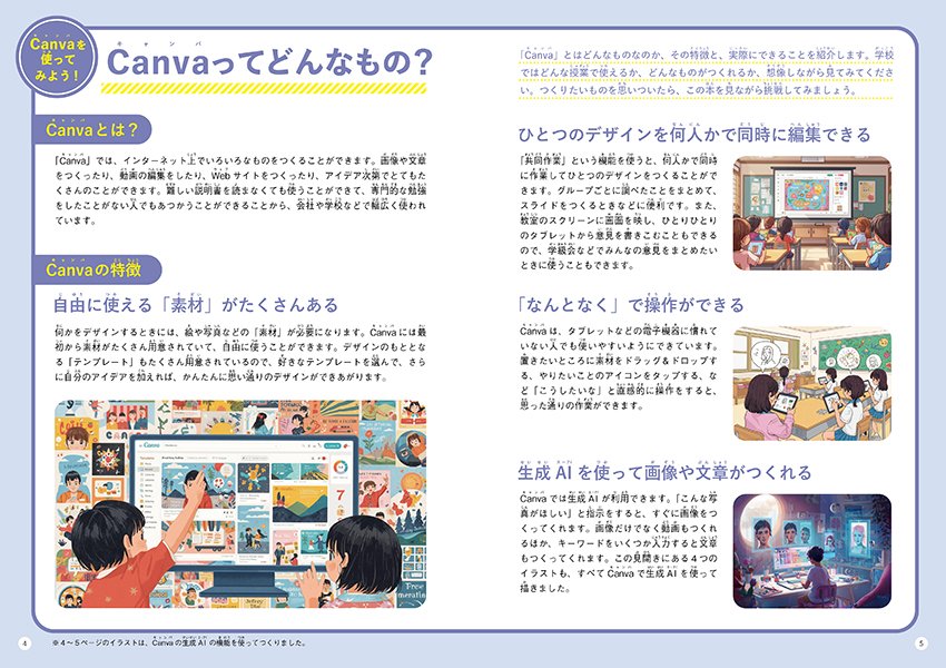誰でも直感的にかっこいい作品がつくれるデザインツール「Canva」。授業や課外活動で子どもひとりで利用するためのノウハウが満載。シリーズ1巻では、ホーム画面の操作法や、テンプレートやフォントの扱い方、AIでの画像のつくり方の基本を解説。