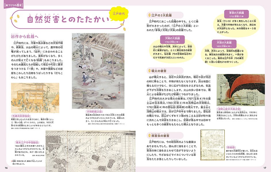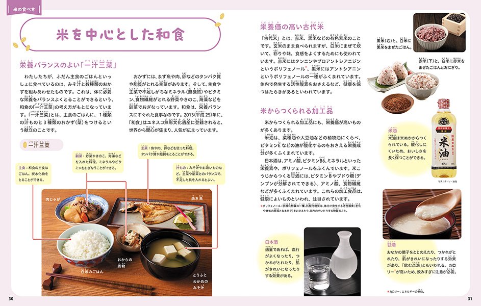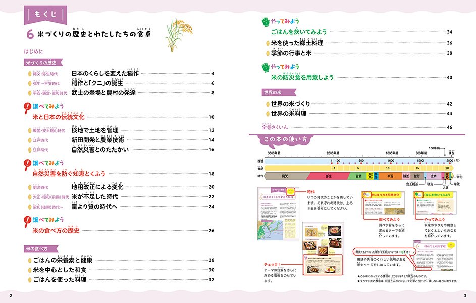 第6巻では、巻の前半では、約3000年前に日本に米が伝来してから、昭和以降に「量より質」を重要視するようになった現在までの米づくりの歴史を詳しく説明しています。後半では、わたしたちのくらしと米をテーマに、栄養素や食べ方、郷土料理、季節の行事食、米の防災食、世界の米づくりなどを紹介。